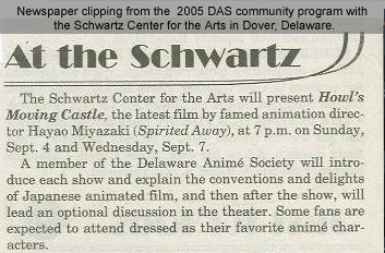 The Schwartz Center for the Arts in Dover, DE asked the DAS to put on a program for their premiere of 'Howl's Moving Castle' on 9/4 and 9/7/05. Program included: intro to the movie, cosplay demo, discussions of anime vs American Cartoons, Miyazaki and other topics, handouts and more. The event was successful with 80-100 people attending each night. Due to our efforts, the Schwartz Center will be considering other Anime and Asian films for future showings. | ![]()