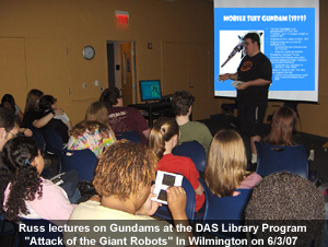 The DAS was asked by the Brandywine Hundred Library in Wilmington, DE to put on another anime program in June 2007. The program is a brief history of the mecha anime genre including Osamu Tezuka's works, Gundam, Macross, Transformers, Voltron and more! Included will be showings, trivia for prizes, arts and crafts, short lecture and discussion. |